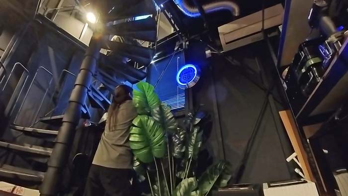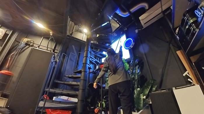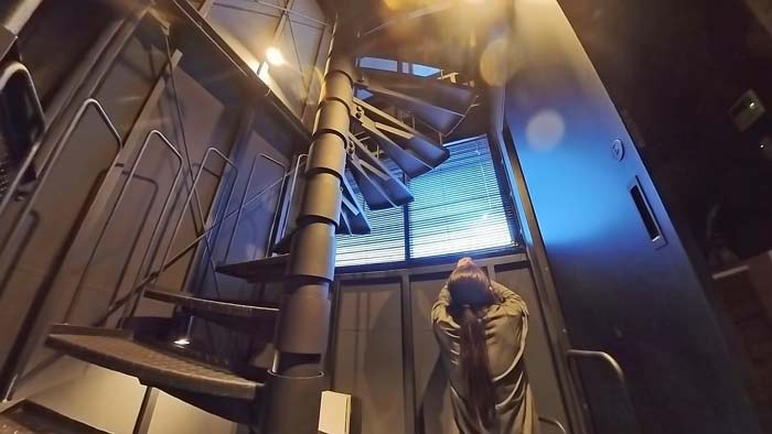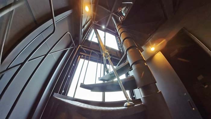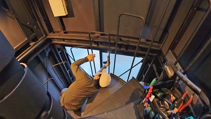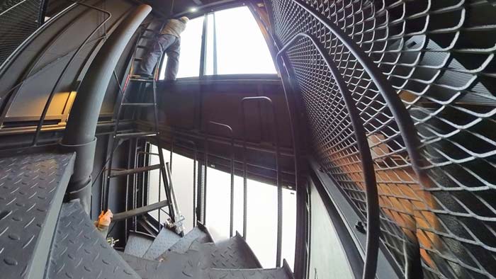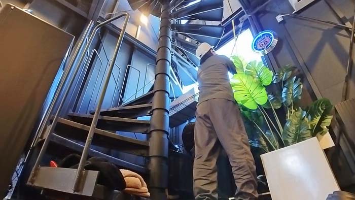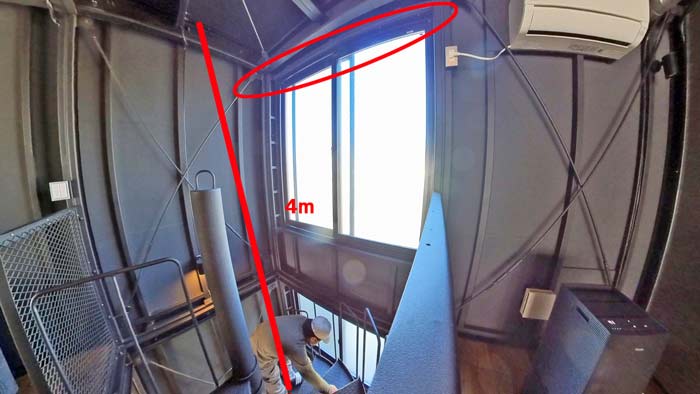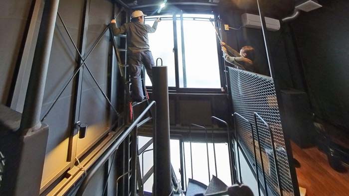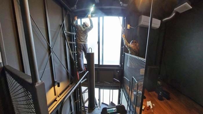 螺旋階段の上へアウトリガー付き梯子が必要だったり、特殊な建物形状で木枠ではないので加工等のかなり大変な作業となりました。