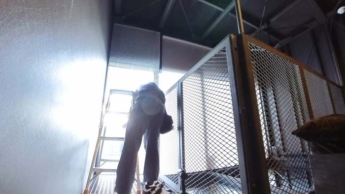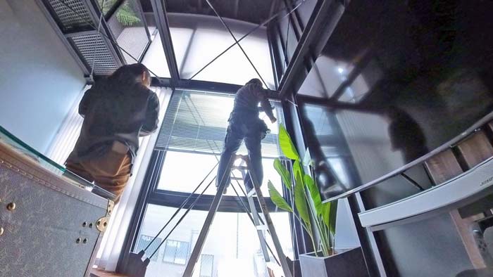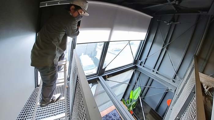 前回は螺旋階段へ梯子を掛けての特殊作業でしたが、今回も吹き抜けへ足場を掛けての難解作業です。