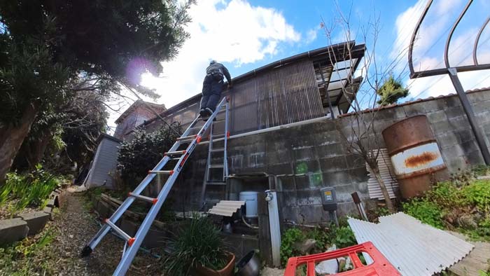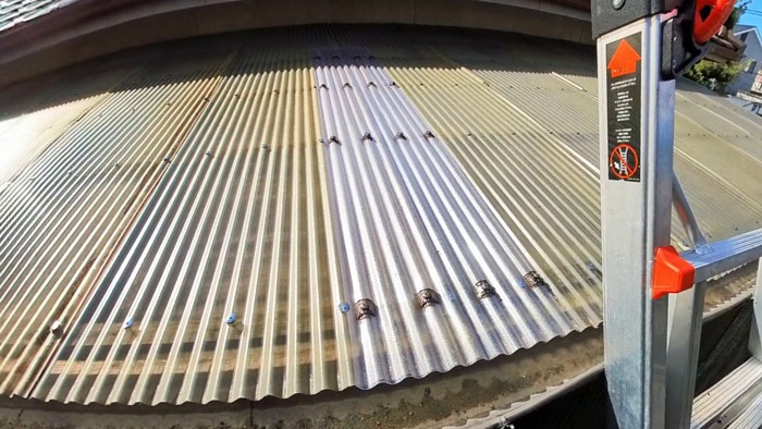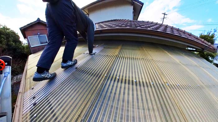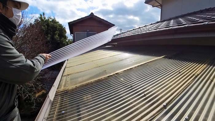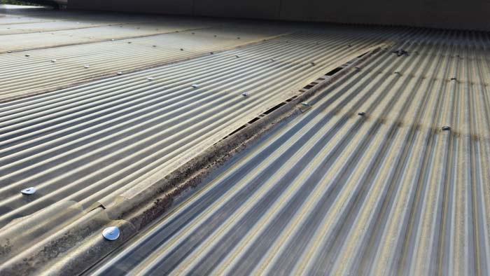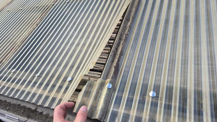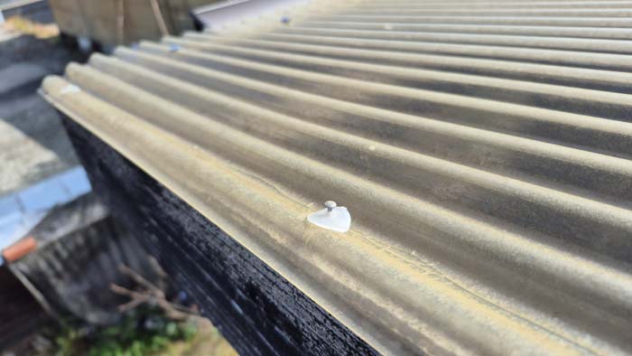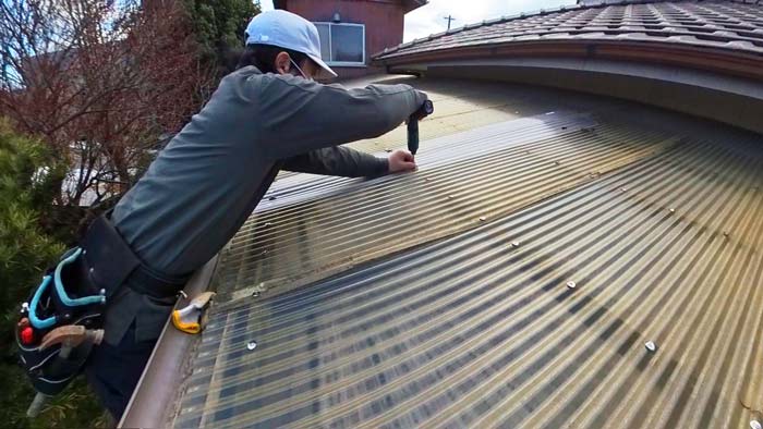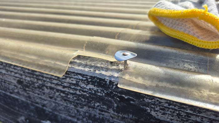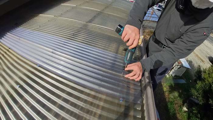 今回の様に釘押さえの場合、抜けて波板破損が無ければ一枚丸っと交換可能ですが、波板が劣化破損している場合は釘抜き時に被害が広がるので上からもう一枚で押さえるのが吉です。