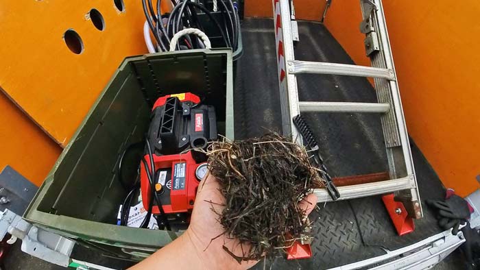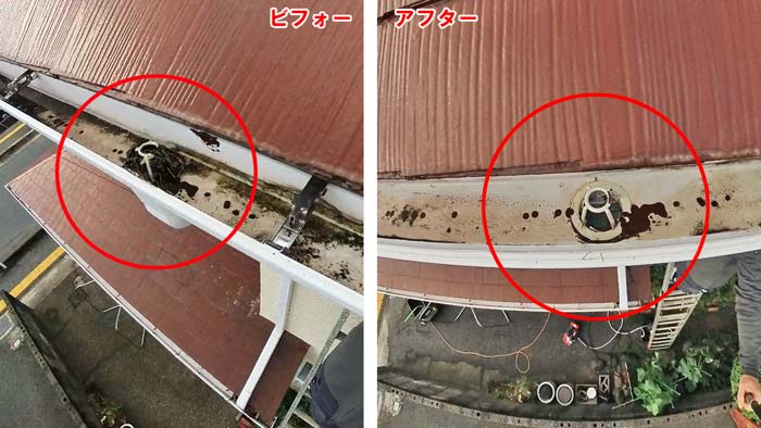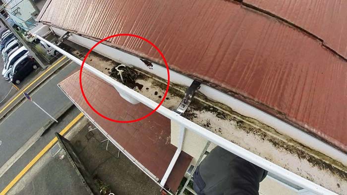 お次は先程確認した2F排水口の草木を全て取り除きます。