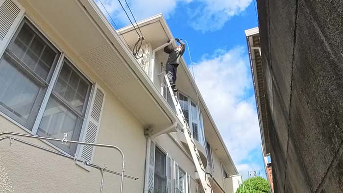 2Fからこのルートでしっかり地面に流れるまでワイヤーライン通して高圧で流します。