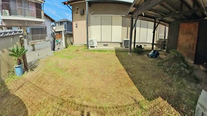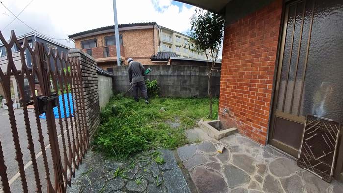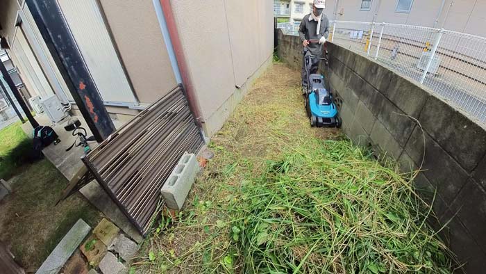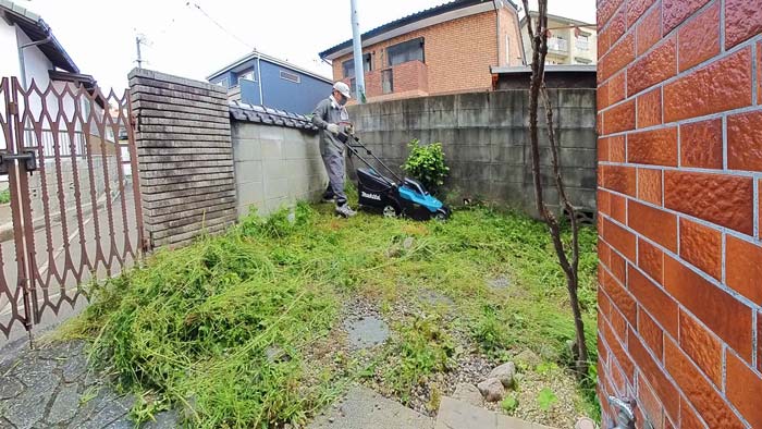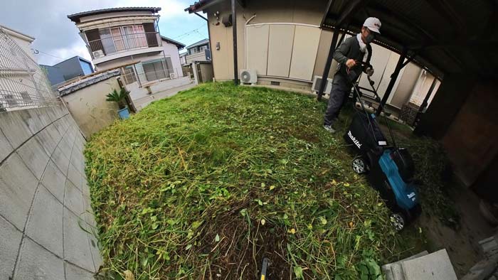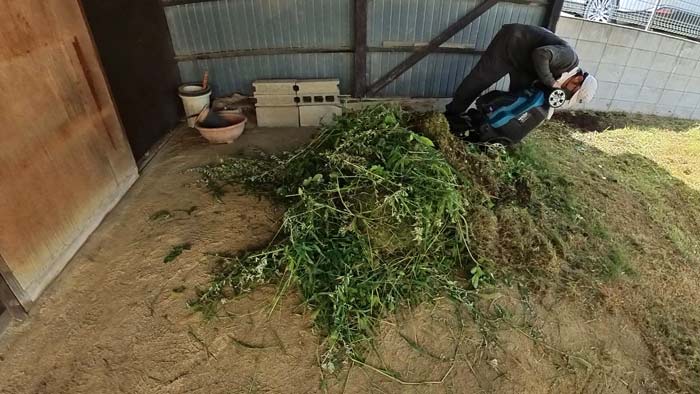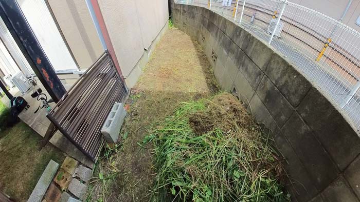 今回は回収不要でしてお客様で処分は頑張られるとの事でゴミ袋に詰めやすいよう三カ所に刈草の山をつくっていきました。