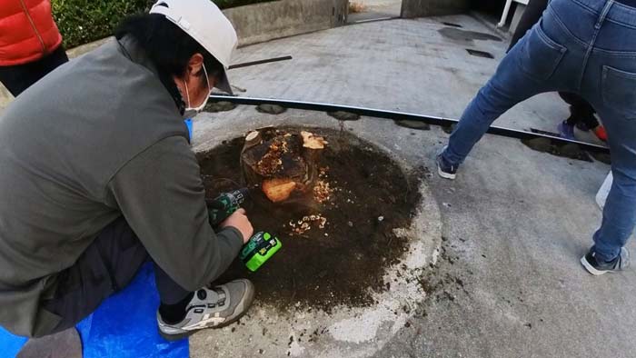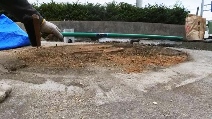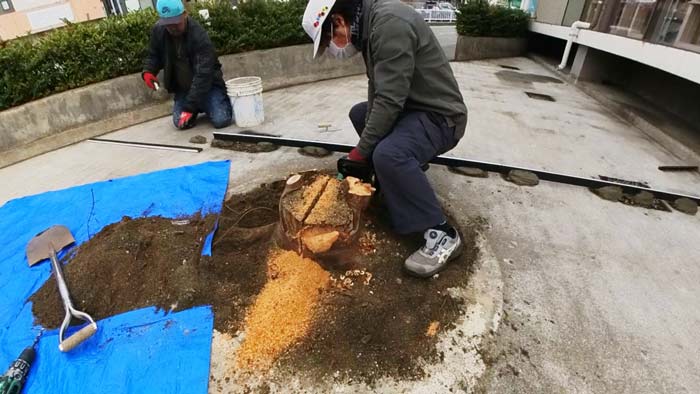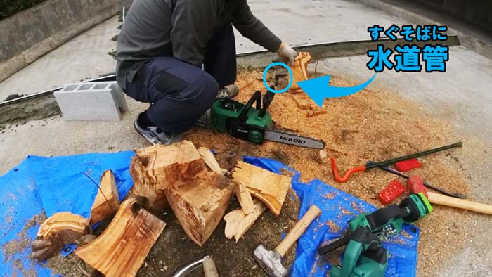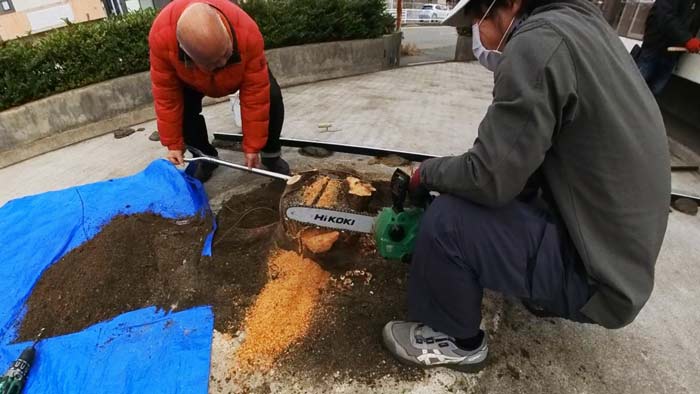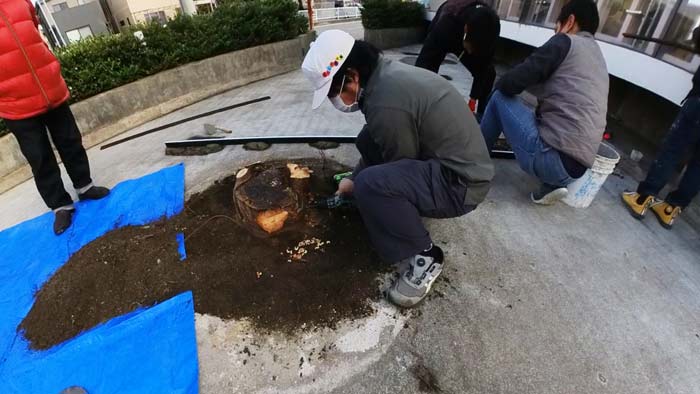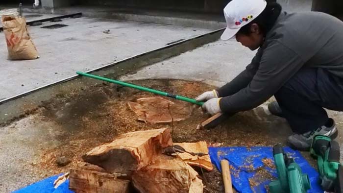 その後は左官屋さんがセメントで埋めるので、切り株があると進まないので左官職人さん達と同時進行のため急ぎです!💦