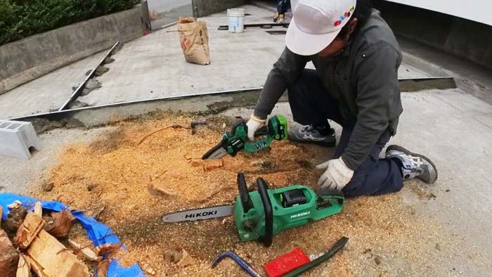 先にドリルでカット部分を20カ所程度穴あけして電動チェンソー負担を楽にします。