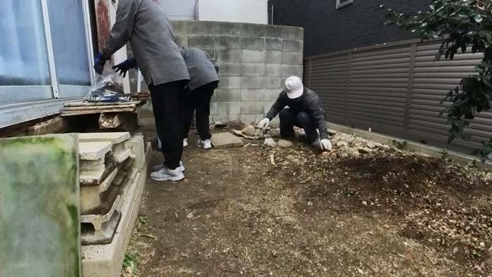 今回は導線ルートが特殊で家の中を通り、撤去していきますので通常より大変な作業となりますので三人でリレー形式で玄関へ出していきました。
