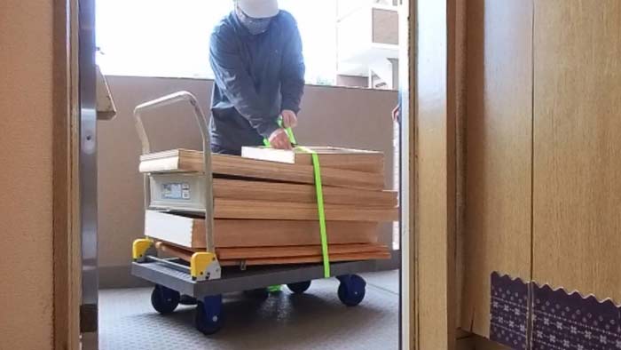 玄関導線も含めて確かにそのままでの搬出はできませんのでしたので解体して外へ出しました。