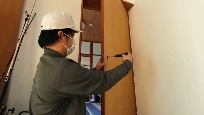 これが内側から開かなくなったドアですが、出れなくなると怖いのでラッチがガムテープで止められてますね。