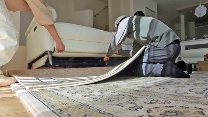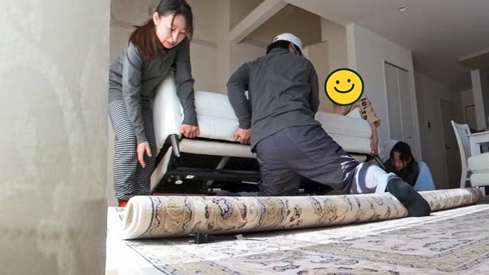 ソファーを希望の位置まで後ろへ移動した後に、再び絨毯を入れていきます。