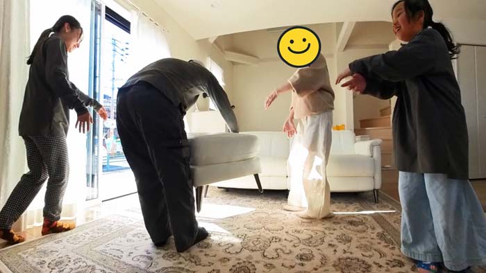 むすめに絨毯の端っこを手元まで手繰り寄せてもらいます。