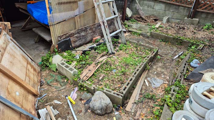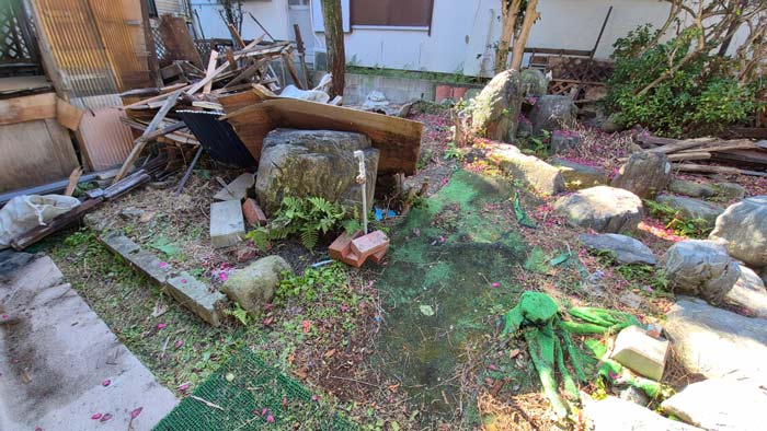 【庭片付け】激しいお庭の端材(加工木)・生木・波板・撤去の現調へ行ってきました。