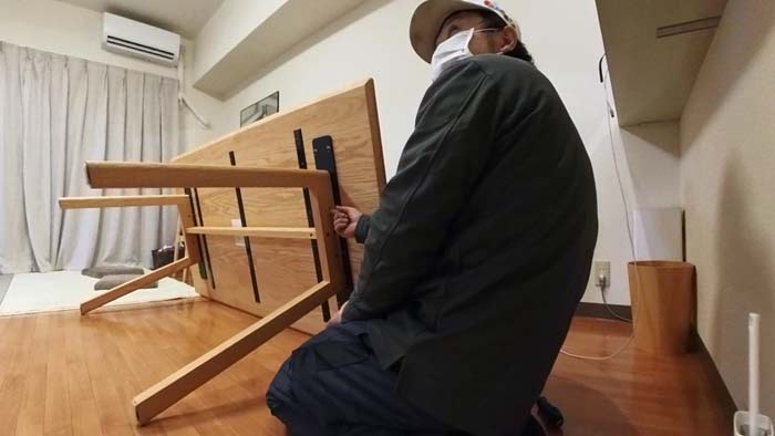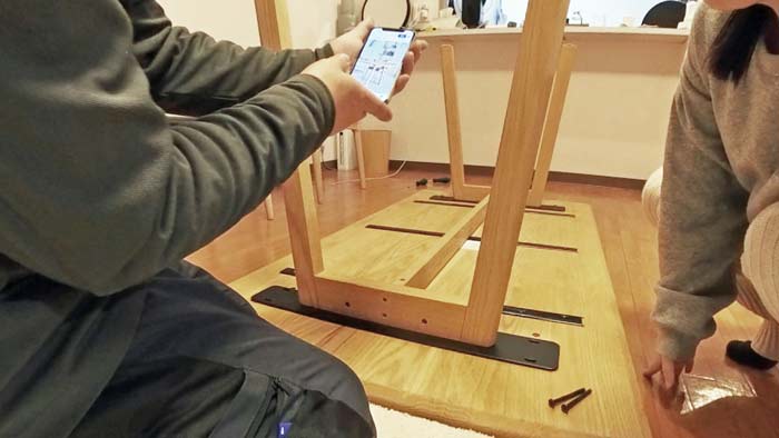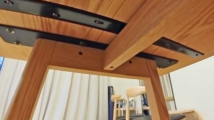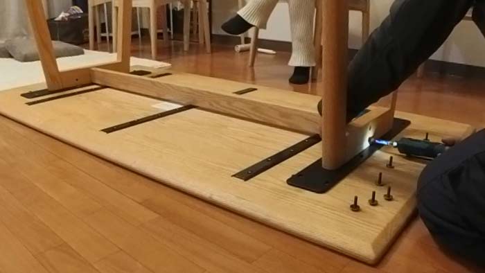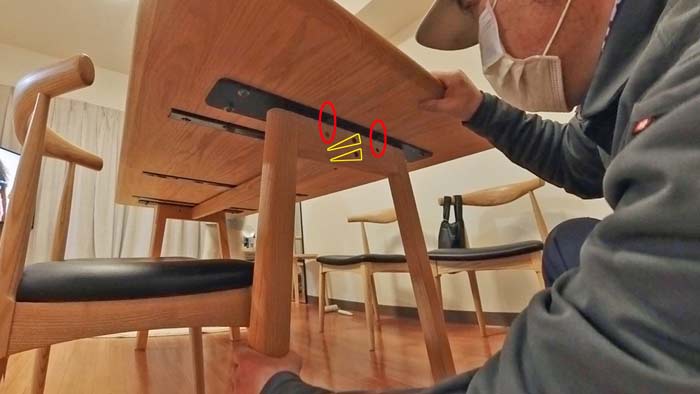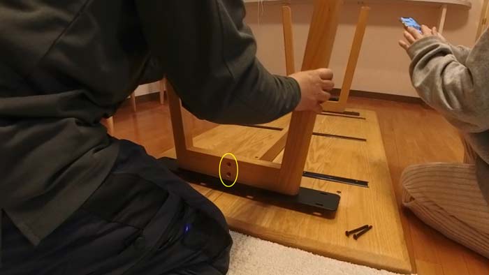 内側にテーブルとの固定穴がむき出しで二つ見えてますが、これが正しい組み方ですね。