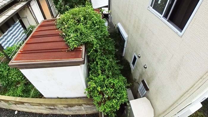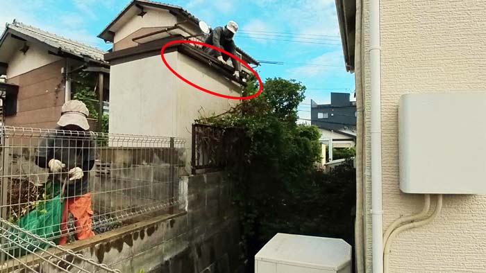 次は物置の上から切断ですが、お隣様の方へ落ちたら6m以上あるので本当に死ぬので気を付けながら!