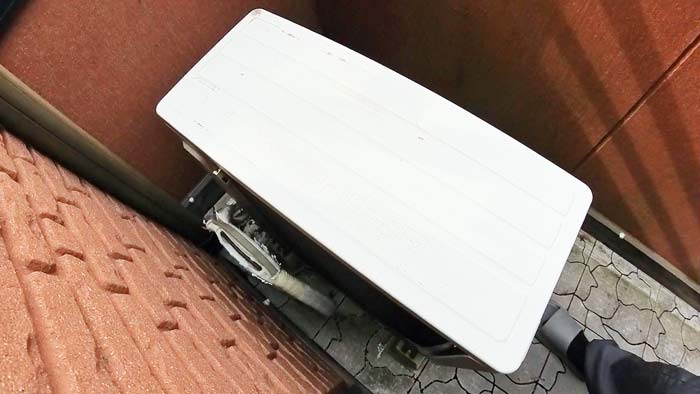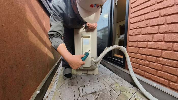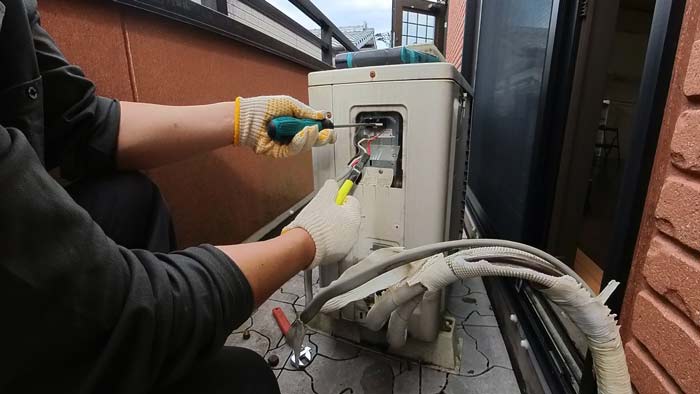 室外機のカバーを開けます。