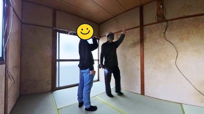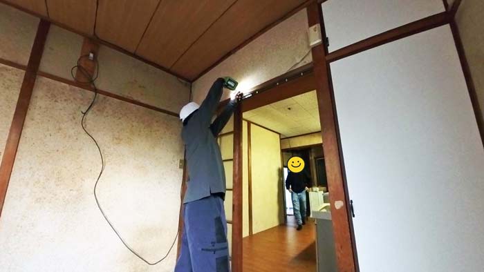 釘とビスだらけのお部屋で作業の途中、リフォーム会社様の社長到着です!