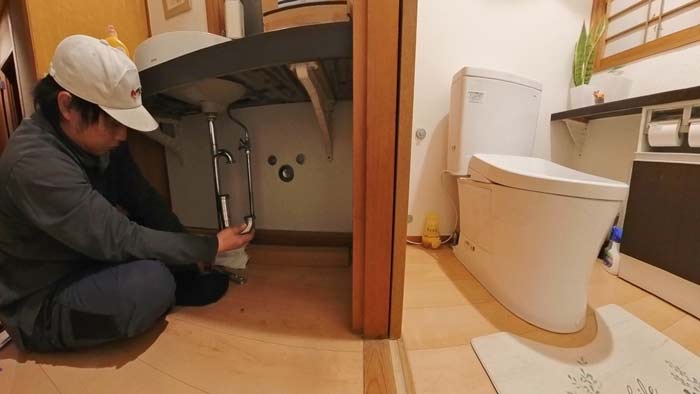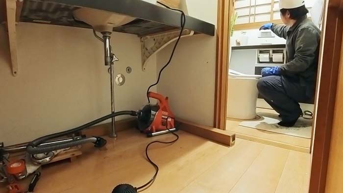 外枡からみるとこの洗面台下水が末端ですので、ここから外枡まで全てを綺麗にします。