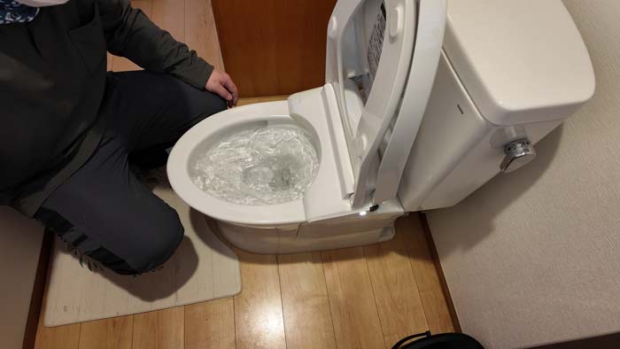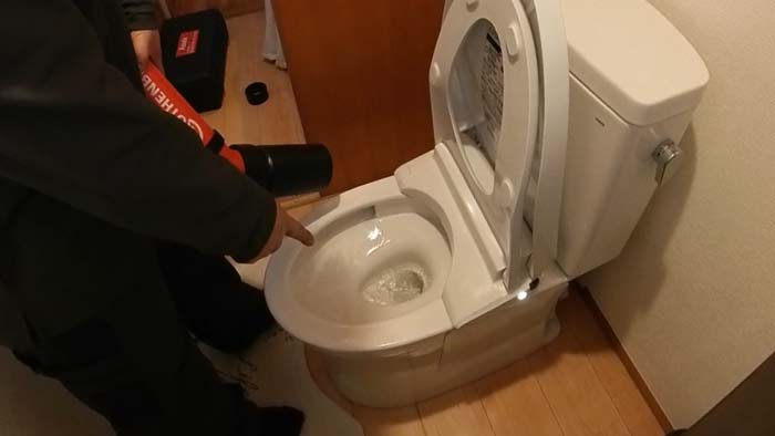 まずは便器の中の詰まりか下水配管詰まりか判断するために便器側を圧力で押して確認。